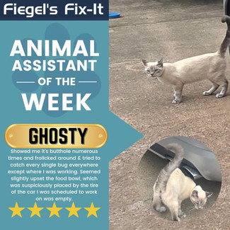 At Fiegel’s Fix-It, our Animal Assistants play a vital role in daily operations—mostly by boosting morale and causing mild chaos. From dogs handling shop security and leftover detection, to cats overseeing management from high places, plus cows, horses, and goats providing judgmental stares, peaceful vibes, and occasional mischief.